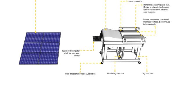 The dimensions of the rectangular invention would include a height of 48 inches, an adjustable width 24-48 inches, and a lenth of 42-48 inches, produced in heights to accommodate larger-sized patients